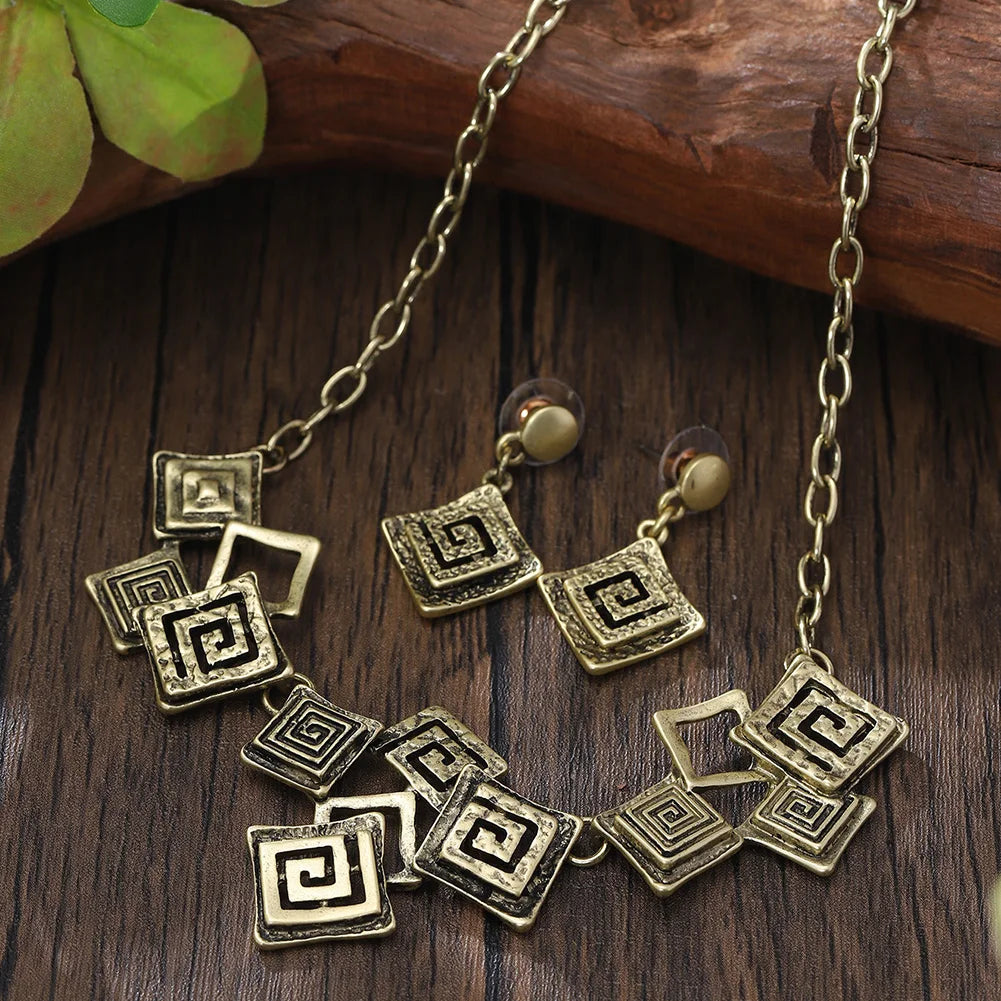 Ensemble de bijoux en alliage de zinc coloré, rétro, géométrique ,carré spirale. Un joli bijou pour femmes